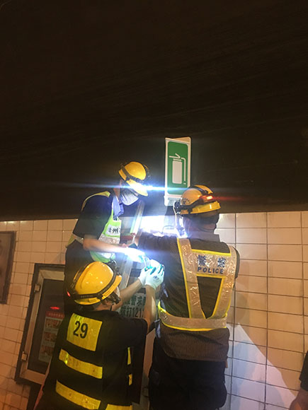 圖為維修人員在更換消防標(biāo)志燈