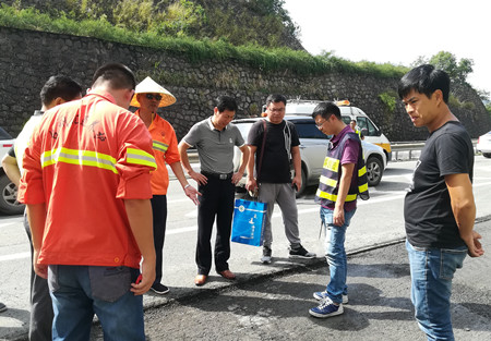 圖為集團(tuán)總工程師江輝與相關(guān)人員在現(xiàn)場(chǎng)協(xié)商病害處置方案 根據(jù)施工方反應(yīng),臨海南匝道段瀝青路面病害較為嚴(yán)重,江輝一行即刻邀請(qǐng)路面專(zhuān)項(xiàng)工程設(shè)計(jì)方共同到現(xiàn)場(chǎng),仔細(xì)檢查瀝青路面病害情況,并根據(jù)病害程度,裂縫、車(chē)轍等情況協(xié)商確定相應(yīng)的專(zhuān)項(xiàng)處置方案,以便更好地開(kāi)展路面維修工作。