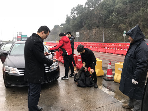 31日是春運(yùn)的前一天,下起了今年的第一場(chǎng)大雪。當(dāng)天10:30分左右,三號(hào)車道如往常一樣正常、有序,該車道正在檢查綠農(nóng)車。這時(shí)一輛牌照為浙JVIT6*黑色小轎車緩緩駛?cè)耄蝗辉撥嚰铀僬{(diào)整方向,想朝二號(hào)車道沖去。與此同時(shí)從它后方快速?zèng)_出一輛轎車檔在了該車前面,接著后方又沖出一輛黑色轎車,攔截在該車后方的去路。兩輛車上跳下幾個(gè)大漢,以迅雷不及掩耳之勢(shì),一擁而上干脆利落的將車內(nèi)三名犯罪嫌疑人控制。 當(dāng)班收費(fèi)員被這一幕驚呆了,不過迅速反應(yīng)過來(lái),啟動(dòng)應(yīng)急預(yù)案,呼叫監(jiān)控員,監(jiān)控員在監(jiān)控視頻中發(fā)現(xiàn)這個(gè)情況后,第一時(shí)間通知所長(zhǎng)。所長(zhǎng)孫明偉得知情況后立即趕赴現(xiàn)場(chǎng),確認(rèn)核實(shí)身份,并令當(dāng)班班長(zhǎng)第一時(shí)間聯(lián)系當(dāng)?shù)嘏沙鏊藢?shí)身份。在得到明確的答復(fù)后,工作人員立刻封閉該車道,為民警辦案提供方便,并打開備用車道正常收費(fèi)疏導(dǎo)過往車輛,組織人員疏散圍觀群眾避免車輛和人員停留過多影響民警辦案。