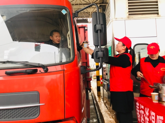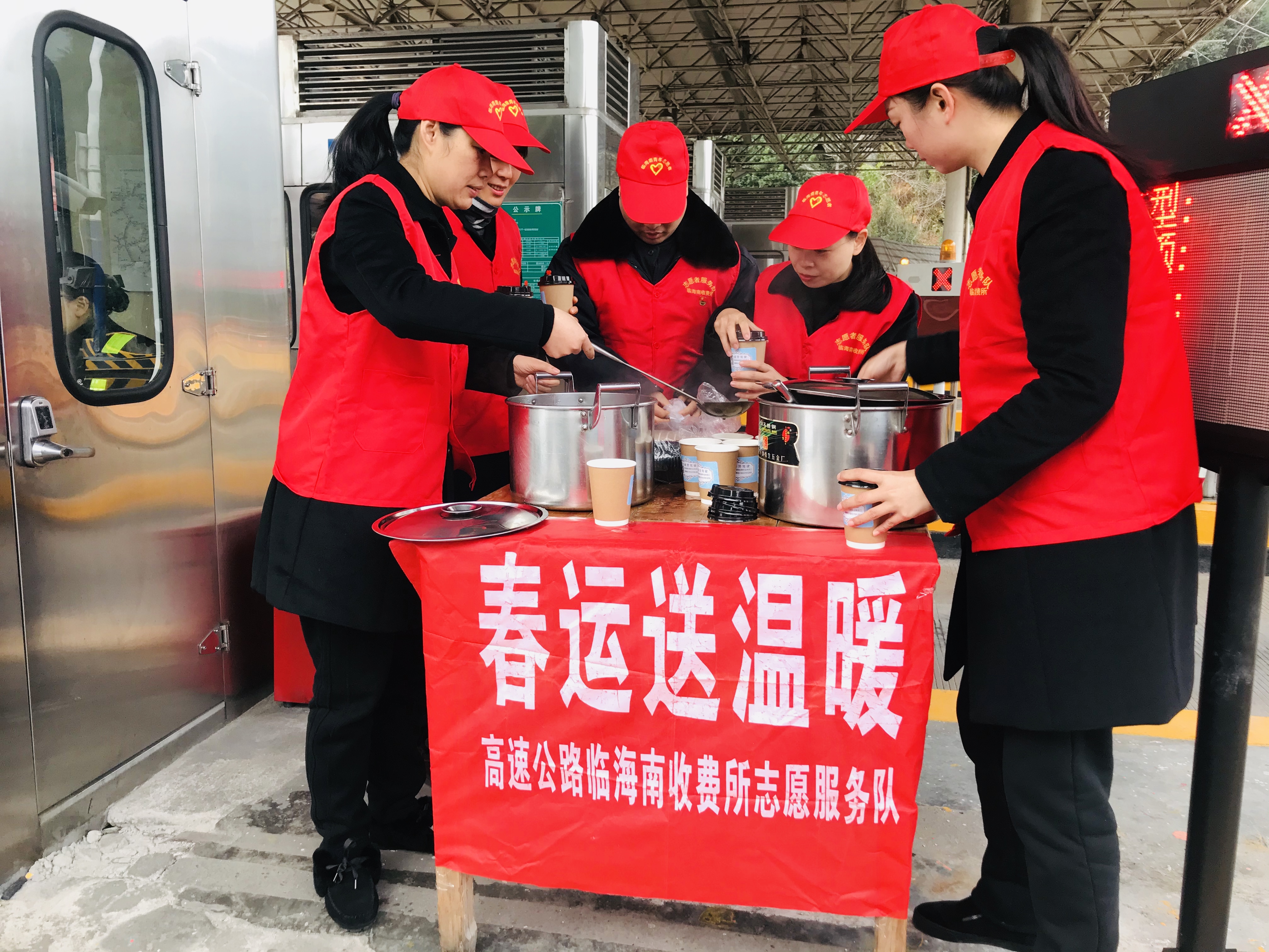 圖為送溫暖活動現場 活動當天,雖然氣溫較低,但在臨海南收費所出口處,身著紅色馬甲的志愿者們頂著嚴寒,依然熱情地為過往司乘人員遞上一杯杯滾燙的姜茶、紅棗茶,并向他們提供問詢、指路、飲水和提示路況信息等便捷服務。除了設置志愿者便民服務臺,臨海南收費所還為過往駕駛員和出行旅客臨時增設休息室,提供道路溫馨提示服務,同時還在車道配備了飲水機、藥品、修車工具等免費便民物品。