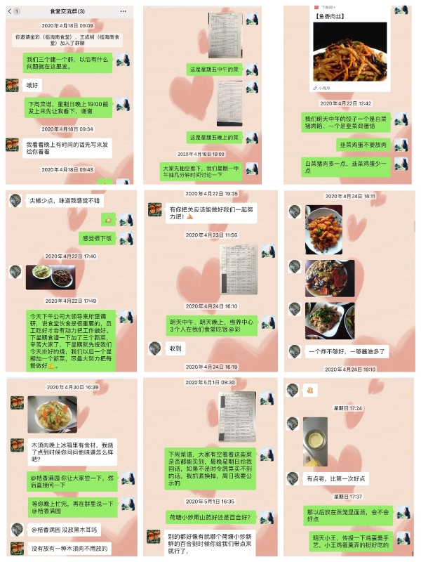 今年4月中旬,所務(wù)陳瑩利用微信建立了食堂交流群,經(jīng)常在群里上傳從網(wǎng)上、廚房APP上下載的一些簡(jiǎn)單又美味的家常菜制作方法。并結(jié)合食堂人員的特長(zhǎng),針對(duì)季節(jié)變換,合理調(diào)整飲食,做到葷素搭配、飯菜每班一日三餐不重樣等要求,提前列出每周菜譜,要求食堂人員根據(jù)菜譜,每周針對(duì)創(chuàng)新家常菜,提前準(zhǔn)備少量食材,精心燒制,待嘗試滿意后再供應(yīng)。