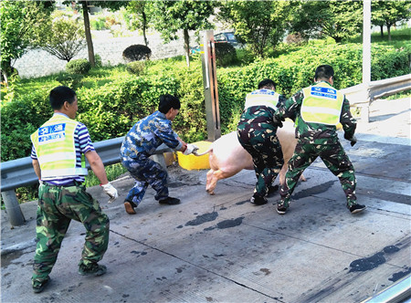 面對(duì)突發(fā)的緊急情況,駕駛員一時(shí)束手無(wú)策,當(dāng)班副班長(zhǎng)立即向值班領(lǐng)導(dǎo)匯報(bào),請(qǐng)求增援。為了防止這頭豬給過(guò)往車(chē)輛造成安全通行威脅,收費(fèi)所工作人員及時(shí)關(guān)閉了7號(hào)車(chē)道,此時(shí)的“二師兄”不讓人靠近,大家只好形成一個(gè)包圍圈,不讓它竄到其他車(chē)道去。幾分鐘后,增援的高速執(zhí)勤隊(duì)員趕到現(xiàn)場(chǎng),大家七手八腳,終于將這頭豬扛著,送回到了小貨車(chē)上。執(zhí)勤隊(duì)員說(shuō),這輛車(chē)上的一頭豬剛剛還在黃土嶺隧道內(nèi)跳出來(lái)一次。