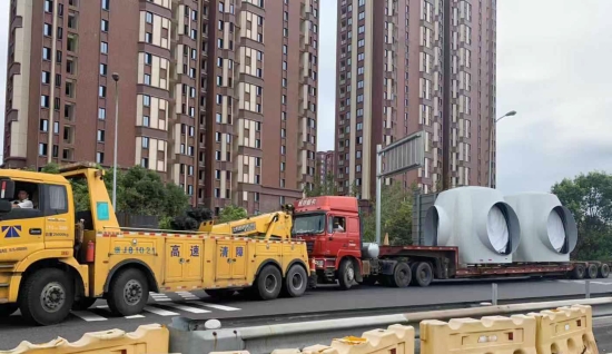 圖為被施救車拖出的超限車 接到電話的第一時(shí)間,當(dāng)班班長上報(bào)所領(lǐng)導(dǎo),并丈量回復(fù)指揮中心出口超寬車道寬為4米,進(jìn)口超寬車道地面寬為4.8米。經(jīng)協(xié)調(diào),超限車輛從臺州收費(fèi)所入口車道下高速。副所長和班長隨即拆除內(nèi)廣場的中央隔離帶,以便車輛可以通行。11:50分,交警攔住寧向出囗車,入口封閉。施救車拖著該車緩緩從入口車道開出。 經(jīng)詢問得知,該車辦理了超限運(yùn)輸車輛通行證,運(yùn)載大型輪轂從樂清上高速去內(nèi)蒙,結(jié)果行駛至臺州時(shí),車子出了故障。該車車重84噸,原本需要繳納通行費(fèi)695元,大件運(yùn)輸優(yōu)惠后僅需繳納395元。雖然車子壞了,但駕駛員依然向工作人員表示感謝,并感言合法裝載的好處,不然還要面臨處罰。入口封閉大概二十分鐘后,車道恢復(fù)通行。