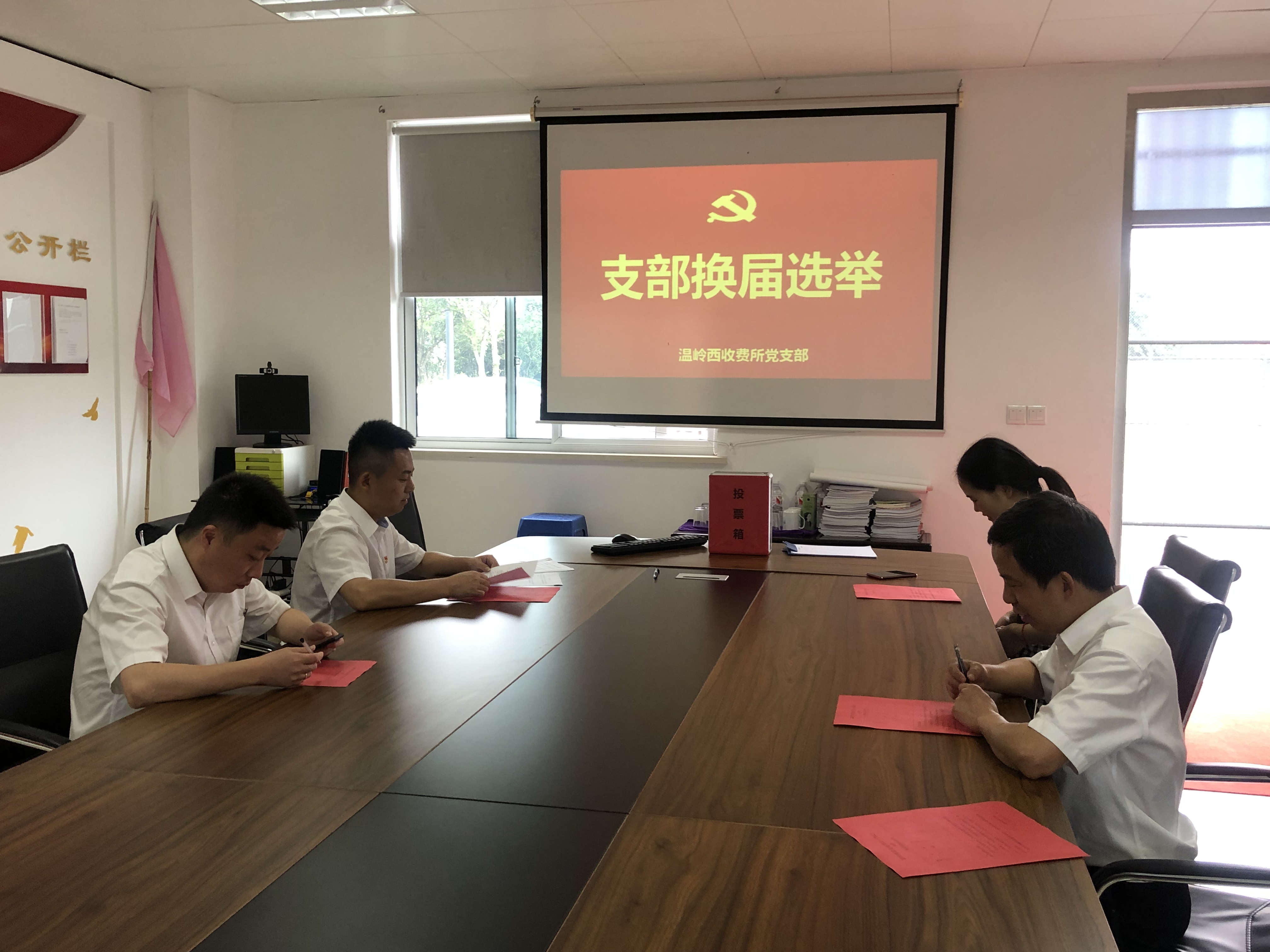 溫嶺西收費所黨支部開展換屆選舉工作 6月11日上午,溫嶺西收費所黨支部在所會議室召開黨員大會,開展換屆選舉工作,支部全體黨員參加會議。
