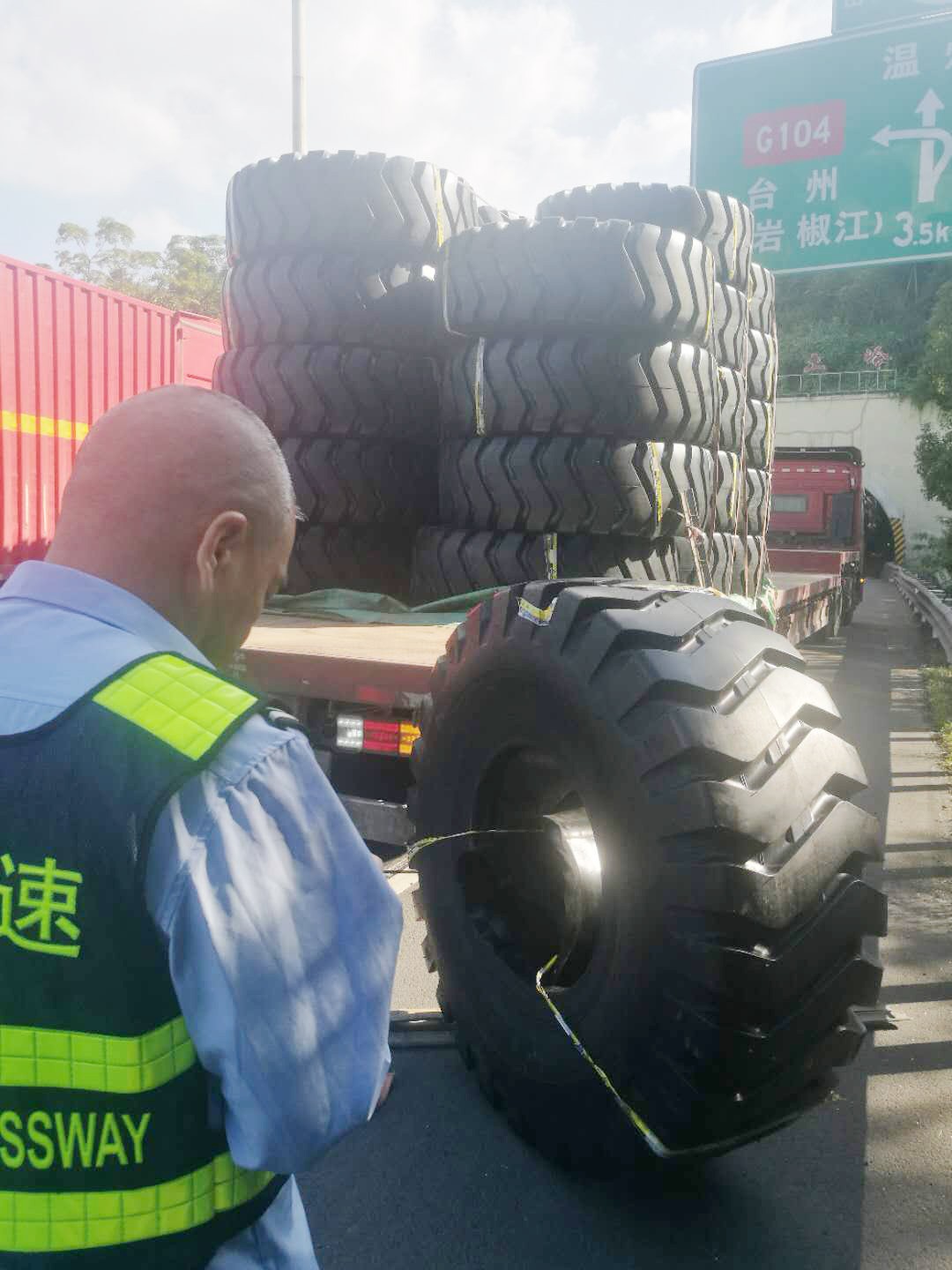 執(zhí)勤隊(duì)接警后立即趕往事故地點(diǎn),一輛運(yùn)載輪胎的貨車停靠在主車道,其中一個(gè)巨型輪胎滑落到硬路肩上,致使后方車輛紛紛避讓。為及時(shí)消除險(xiǎn)情,執(zhí)勤隊(duì)快速在現(xiàn)場(chǎng)做好安全警戒工作,同時(shí)將現(xiàn)場(chǎng)情況反饋給監(jiān)控中心。由于貨車綁繩索松動(dòng),重達(dá)300多斤的輪胎脫落在地,隨后執(zhí)勤隊(duì)協(xié)同施救中心、駕駛?cè)?/span>員合力將掉落的輪胎先拖至車旁,經(jīng)過長達(dá)半個(gè)小時(shí)的搶險(xiǎn),跌落的貨物終于完好無缺地回到貨車上,道路恢復(fù)暢通。 筆者溫馨提醒:在高速公路行駛過程中,駕駛?cè)藨?yīng)注意將車上的貨物固定好,途中要隨時(shí)注意貨物及捆綁繩索是否松動(dòng)。無論是車輛撒落物還是人為拋灑物,都會(huì)給道路安全暢通埋下了重大隱患! 林玲