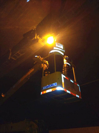 1月31日上午,該所執(zhí)勤隊員在隧道巡邏時發(fā)現(xiàn)溫向快車道一盞照明燈被超高車刮蹭而導(dǎo)致燈罩損壞,燈頭及組件掛落蕩在橋架下,很容易造成二次事故而引起人員傷亡。一發(fā)現(xiàn)該隱患,隊長李新波立即向所長李立巍報告險情,馬上聯(lián)系高速交警、指揮中心人員,要求立即封道搶修。 大溪嶺隧道所在險情發(fā)生的第一時間作出緊急措施,兩名執(zhí)勤隊員在溫向隧道洞口卡口預(yù)警,李立巍向維養(yǎng)中心調(diào)來登高車,三名電工隨即進(jìn)隧道維修脫落的燈罩。經(jīng)過25分鐘的快速搶修,目前設(shè)備已能正常使用,隧道恢復(fù)通行。 李新波