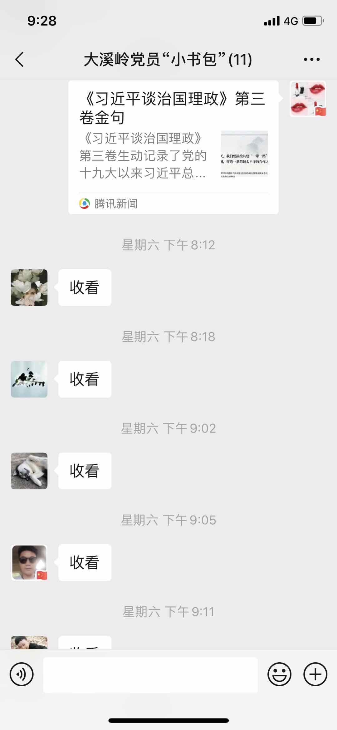 黨員“小書包”的建立,進(jìn)一步拓展和暢通了聯(lián)系黨員的信息渠道,可以24小時(shí)在線聯(lián)系黨員、征求意見,能在線進(jìn)行實(shí)時(shí)回復(fù)和互動(dòng),同時(shí)可以通過微信群及時(shí)發(fā)布上級(jí)文件精神、習(xí)近平總書記重要講話內(nèi)容、學(xué)習(xí)教育心得、會(huì)議通知等等,進(jìn)一步提高學(xué)習(xí)教育效能。 黨員“小書包”的建立,讓黨員們的學(xué)習(xí)內(nèi)容不受書本限制,學(xué)習(xí)教育不受地域、場所的限制,在繁忙的工作學(xué)習(xí)之余,大家可以在微信群中了解當(dāng)前時(shí)下最新的學(xué)習(xí)內(nèi)容、信息和動(dòng)態(tài),相互學(xué)習(xí),交流體會(huì),無形提升自己的政治素養(yǎng)。 黨員“小書包”的建立,實(shí)現(xiàn)了黨組織和黨員之間“親密”、“即時(shí)”、“微距”的接觸,加強(qiáng)了黨員同黨組織之間的信息互動(dòng)。通過“小書包”的建設(shè),大溪嶺學(xué)習(xí)教育時(shí)刻保持鮮活的生命活力和時(shí)代氣息,形成了“輕松自主學(xué)習(xí)、實(shí)時(shí)互動(dòng)交流”的良好學(xué)習(xí)氛圍,提供了更好的動(dòng)力。
