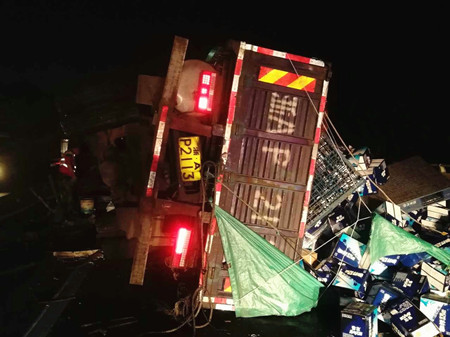 8月25日凌晨4點,甬臺溫高速溫向1648+7路段,一輛運啤酒的大貨車因司機疲勞駕駛,導致車輛撞上中央護欄而側翻,啤酒灑滿一地,后方兩輛貨車避讓不及造成多車事故。