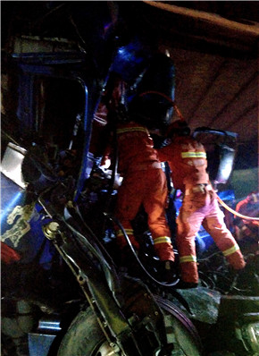 5分鐘后,兩輛紅藍警燈閃爍的施救車迅速飛至現場。此時現場多車損毀嚴重,尤其最后一輛大貨車駕駛室嚴重變形,司機受傷,胸部以下被車頭卡住無法動彈,血水從門縫流出,現有設備無法有效救援,也無法知道有無生命危險。