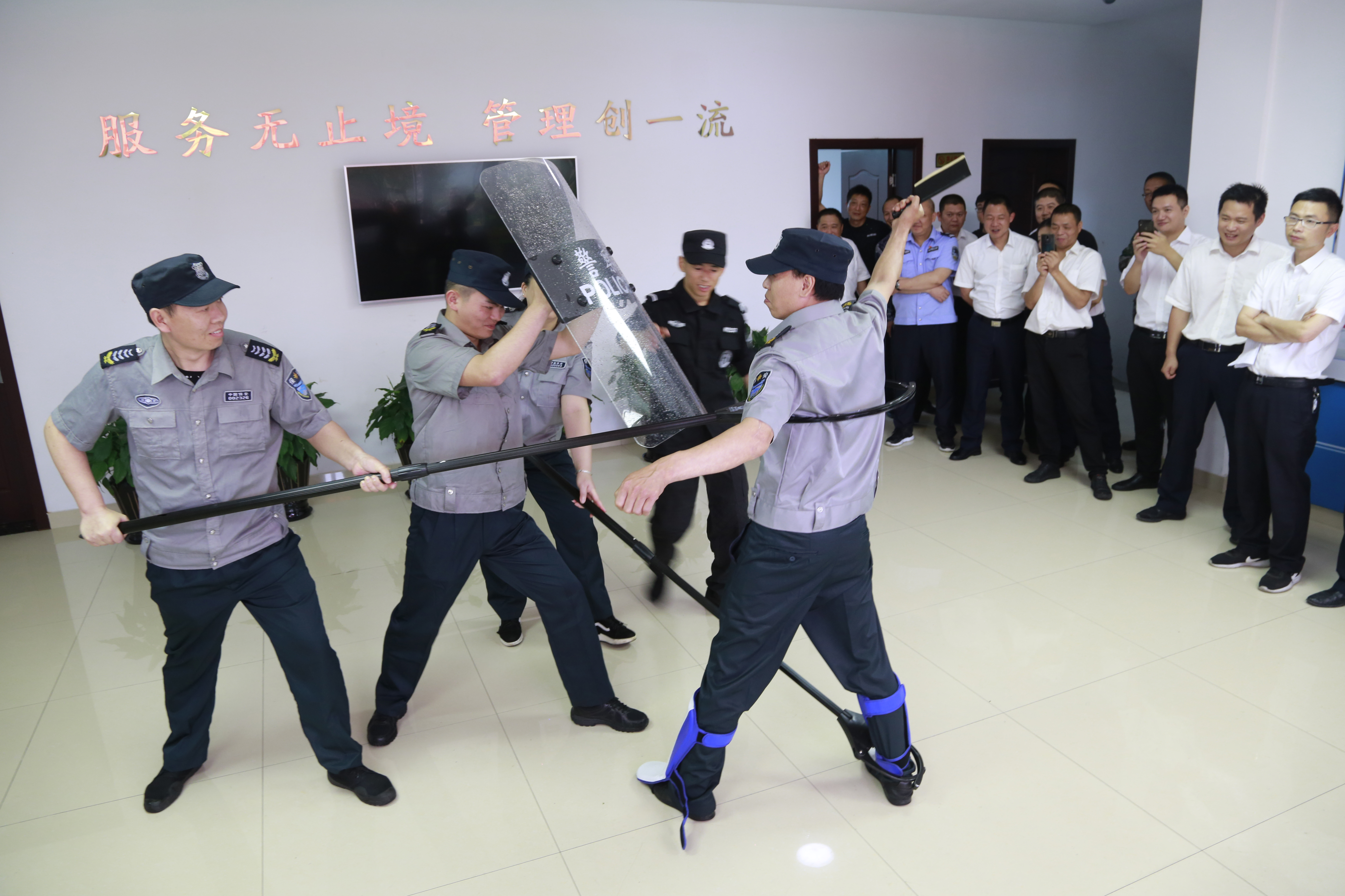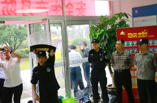 演練開始前,盧尚明對防爆盾牌、防爆鋼叉、抓捕器、警棍等各類防爆器材的功能和使用方法進行一一講解,并示范操作,以及帶領(lǐng)大樓浙師大印象物業(yè)人員現(xiàn)場練習(xí)器械使用。