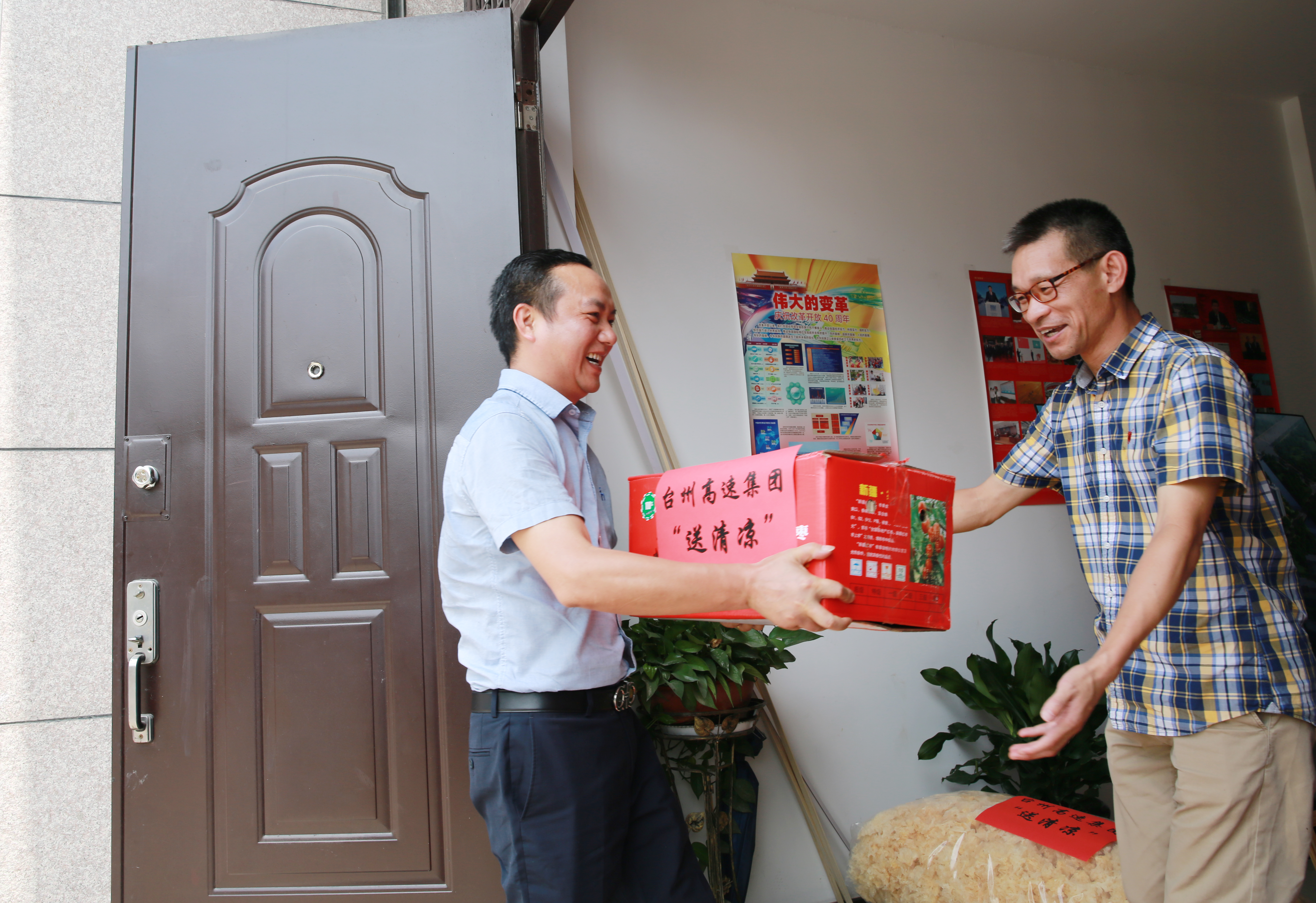 沁人心脾|臺州高速集團開展“夏日送清涼”活動 7月15日上午,臺州高速集團開展“夏日送清涼”活動。集團黨委書記、董事長、總經理陳文波,副總經理陳保衛、羅小將、章海峰、工會主席項同富兵分兩路,帶領送清涼慰問組同志,深入高速交警、路政、匯通養護公司、各收費所、隧道所、中心、子公司等單位看望慰問值守人員并送去慰問品,向冒著高溫酷暑辛勤工作的工作人員表示敬意和慰問。感謝廣大員工在高溫下堅守崗位、辛勤勞動,集團領導親手送上防暑降溫的紅棗、綠豆、蓮子、飲料等物資,為在炎炎夏日中堅持工作的一線廣大人員送去了絲絲清涼。