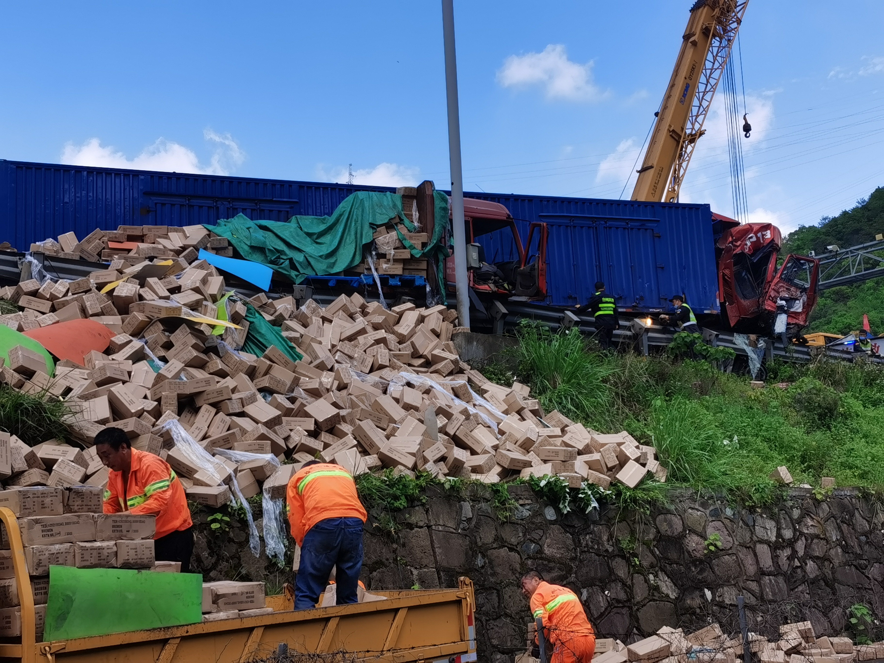 隨后,拖車、救護(hù)車、吊車相繼到達(dá),所有人員立即有序分工,因大貨車車頭卡在護(hù)欄,需要切割,拖車難度較大需要吊車將其拖出,現(xiàn)場(chǎng)救援緊急開(kāi)展。隧道所工作人員協(xié)助駁貨車清理貨物和散落的車架,保證高速路面通暢。 后經(jīng)詢問(wèn)了解,平板貨車因車輛拋錨停在黃土嶺寧向洞口200米處,雖然已將安全警示牌放在車輛后方,但車輛未完全停靠邊上。后方一輛箱式貨車發(fā)現(xiàn)時(shí)緊急剎車,由于當(dāng)時(shí)正下大雨路面濕滑,緊急制動(dòng)后車輛發(fā)生擺尾失控,司機(jī)急打方向想要救車阻止,但是依然撞上了前方的拋錨貨車。 再次提醒廣大司乘人員,雨天路滑,要控制車速保持車距離,遇車輛拋錨,車靠邊人撤離,并撥打高速救援電話12122。 蔣弓
