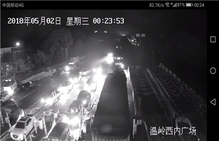 518:27分,黃土嶺隧道發生多起多車追尾現象,事故現場仿佛貪吃蛇,二車追尾、三車追尾、四車追尾,特別是四車追尾現場,除了追尾車輛車頭凹陷變形,被撞車輛車尾面目全非外,一輛白色SUV更是被后車頂到前引蓋上3名司乘人員受傷。隧道所監控員洪慧雯不斷切換鏡頭,向指揮中心、醫院發出報告;早已到達的隧道所執勤隊已在現場維持秩序,引導后方車輛通行,為交警、急救和施救車輛開通生命通道;與此同時,臺州、臺州南和溫嶺西收費所暫時關閉寧向入口。