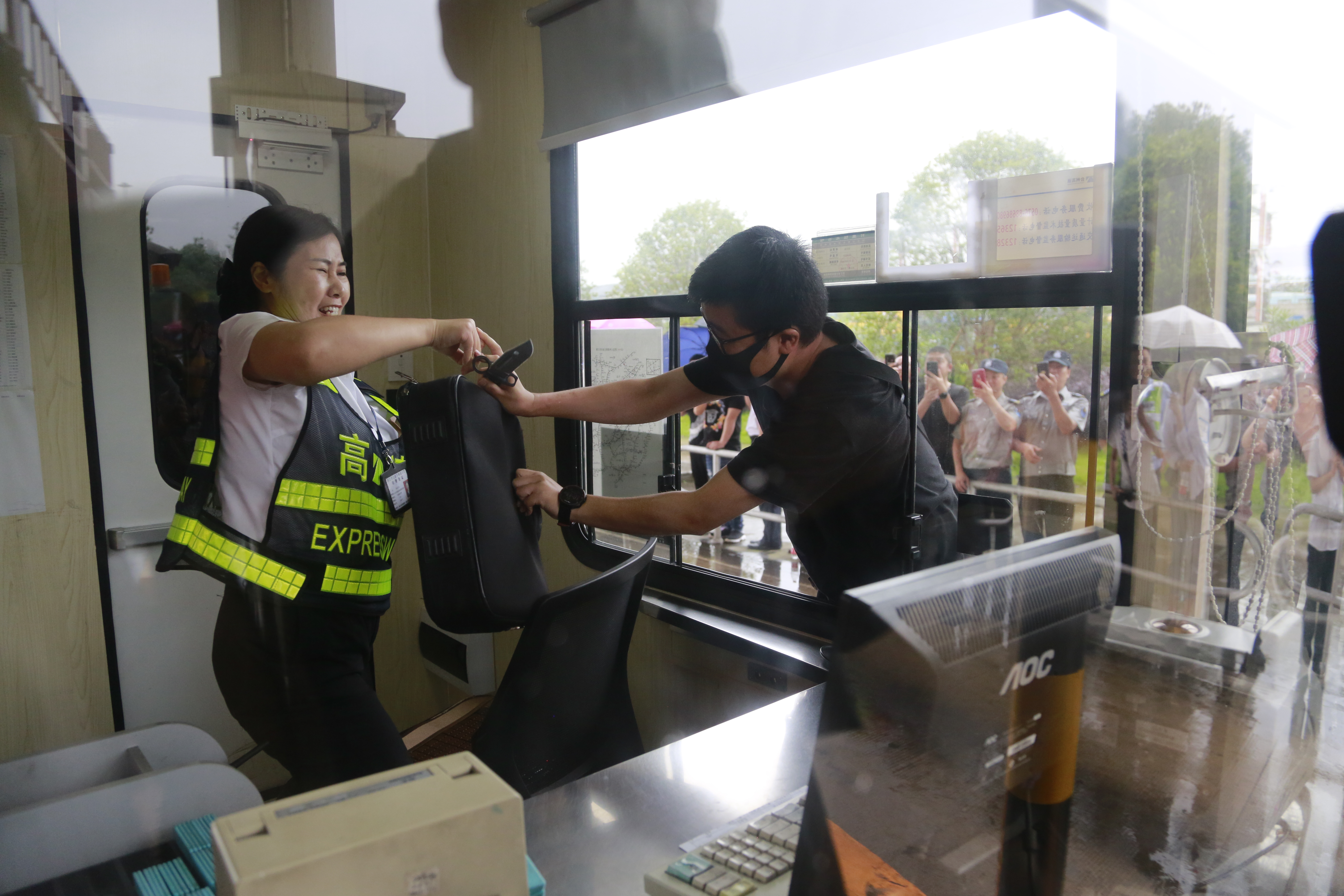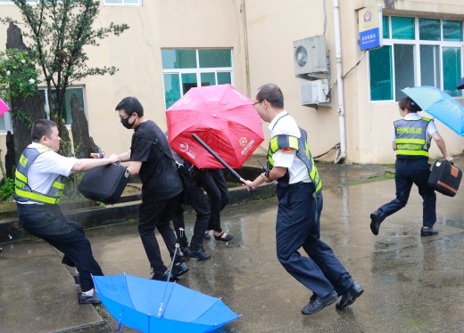 隨后,多名參演員工冒雨模擬收費崗?fù)ず土嘘犗聧徳庥?/span>“歹徒”搶劫的情景開展防盜搶演練。現(xiàn)場,2名蒙面歹徒執(zhí)仿真刀、軟棍威脅收費員交出現(xiàn)金,危機之中,收費站立即啟動應(yīng)急處置預(yù)案并報警求助,收費員有效與歹徒周旋,應(yīng)急處置組人員迅速攜鋼叉、橡膠棒、勞動工具等赴現(xiàn)場支援,值班領(lǐng)導(dǎo)、收費班長、監(jiān)控員合力協(xié)作應(yīng)對歹徒,防盜搶演練順利結(jié)束。