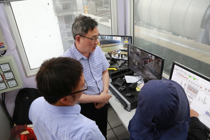 圖為陳文波一行在山海公司瀝青拌合站現場調研
