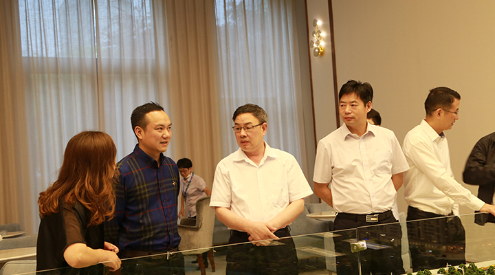 圖為陳文波等領(lǐng)導(dǎo)在沙盤前聽取有關(guān)開盤工作匯報(bào)