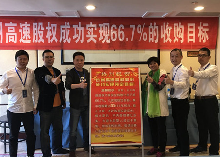 9月8日,收購首日即協議轉625戶,轉讓726萬股,十大股東轉兩戶;9月11日,完成股權轉讓2158萬多股,4天時間就實現第一階段收購目標任務的30%;9月16日,用一周時間實現了股權協議轉讓2769萬多股,完成第一階段收購目標任務約40%;9月24日,市屬國有企業持有股份10844萬股,占總股本50.20%,歷史性地實現了市屬國有股本過半;9月25日,持十萬股以上法人股東已經轉讓7家,持十萬股以上的64個個人股東已轉讓39人;在國慶節后,迎來了股權轉讓小高潮,曾出現連續三天全市協議轉讓股權超過百萬股的喜人成績;10月31日,全市共辦理臺州高速股權協議轉讓904筆,創9月8日股權集中收購以來單日最高紀錄。
