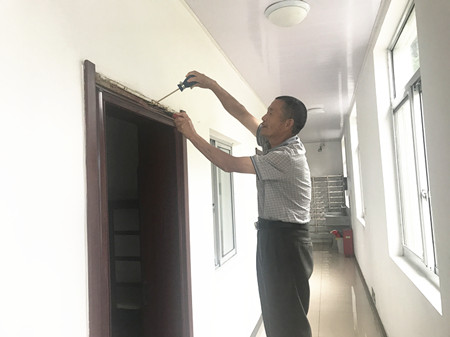 上圖為技術人員在防治白蟻受災處 為全面消除隱患,該所立即組織人員對員工宿舍、綠化帶、辦公樓逐一進行地毯式排查,最終發現三處地方受災最為嚴重,同時在員工宿舍旁綠化帶處找到白蟻窩。該所負責人及時聯系建設局房管處白蟻防疫站技術人員,對樹木、門框等進行防治消殺和用白粉涂擦等方式排除隱患,通過防治消殺和白粉涂擦等方式,有效確保了所內環境的生態資源健康和安全。