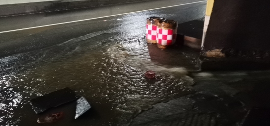 圖為車道水流 當晚19:12分,黃土嶺隧道所中控員徐彤霞發(fā)現(xiàn)寧向隧道主車道路面出現(xiàn)積水,如不及時處置,路面濕滑會讓過往車輛打滑,嚴重影響隧道的安全暢通。為了杜絕安全隱患,管理所立即啟動防汛應急方案,中控員第一時間在管理群發(fā)送現(xiàn)場圖片,并在同一時間通知執(zhí)勤隊與監(jiān)控中心。 執(zhí)勤隊員不顧狂風暴雨趕赴現(xiàn)場,19:19分,斜井現(xiàn)場山上倒灌入隧道的水嘩嘩直流,儲水池水流急促,執(zhí)勤隊員立即分工合作,一組在主車道擺放安全錐采取防護措施,并利用沙包,堵住排水溝壁,使水盡量不往外滲,及時避免了積水對隧道內行車造成的安全隱患。一組檢查潛水泵是否正常運行,查看積水入侵的原因、排水溝通暢情況。