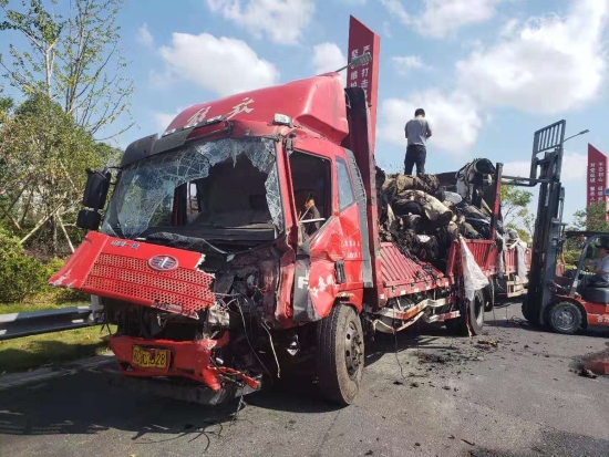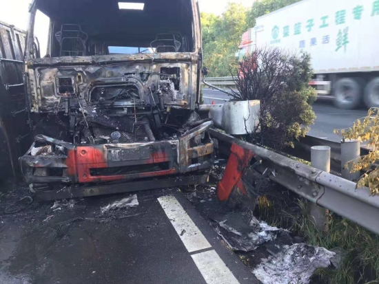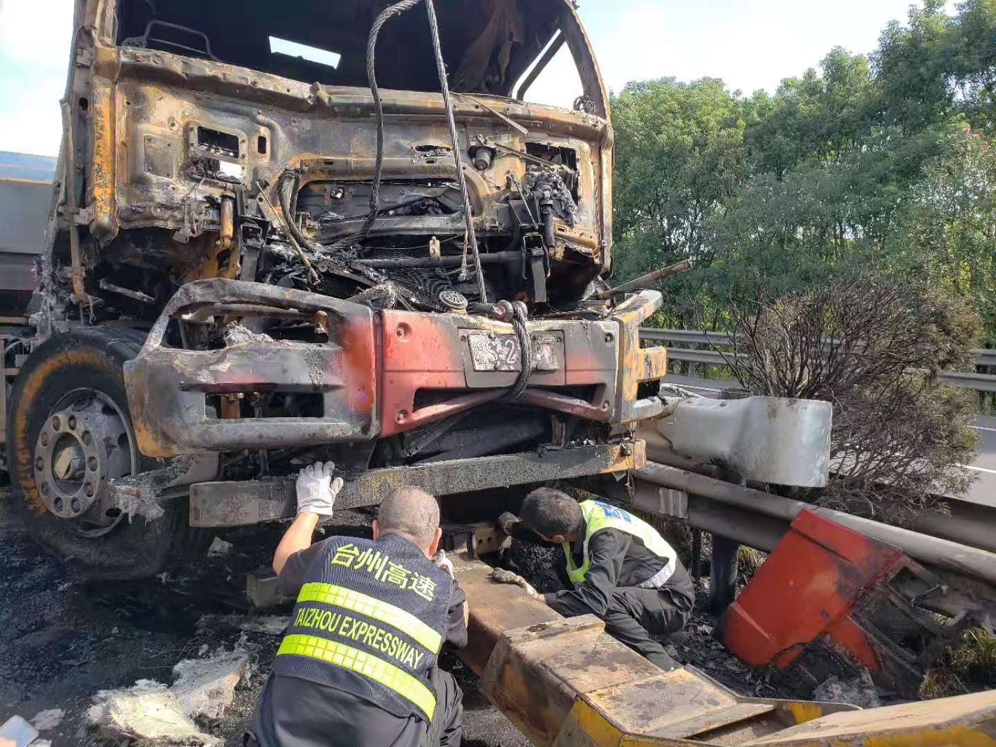 大火在現場留下了幾乎成為殘骸的兩輛車、滿地的油污、車輛碎片、燒剩下的布匹,一股刺鼻的臭味一公里外都聞得到。油污讓路道變得又膩又滑。更為嚴重的是,隨著時間的推移,從事故點開始,堵車開始一公里一公里的蔓延,幾乎快到了臺州收費所。