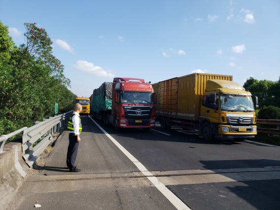 11:30,一輛重載牽引車載著一輛挖機,卡在寧向1658+800唐家橋位置出不來,輔查員童軍偉、王凱又迅速趕往現場,至下午4時,才將事故處理完畢,將牽引車救出現場并進行路產損失勘查。