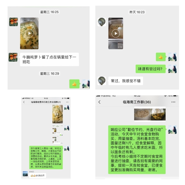臨海南收費(fèi)所不只是單單把宣傳標(biāo)語掛在墻上,擺在桌上。更把節(jié)約舉措落實(shí)到具體行動(dòng)中為了不浪費(fèi)食材,行政人員提前安排一周菜單,并統(tǒng)計(jì)用餐人數(shù),規(guī)劃食材數(shù)量,食堂工作人員按照人數(shù)采購(gòu)當(dāng)天食材控制成本并將每餐燒好菜拍成視頻上傳食堂交流群,更好關(guān)注食堂動(dòng)態(tài),從源頭把控菜量與伙食的品質(zhì),每周還不定期抽查食堂,查看剩余量。