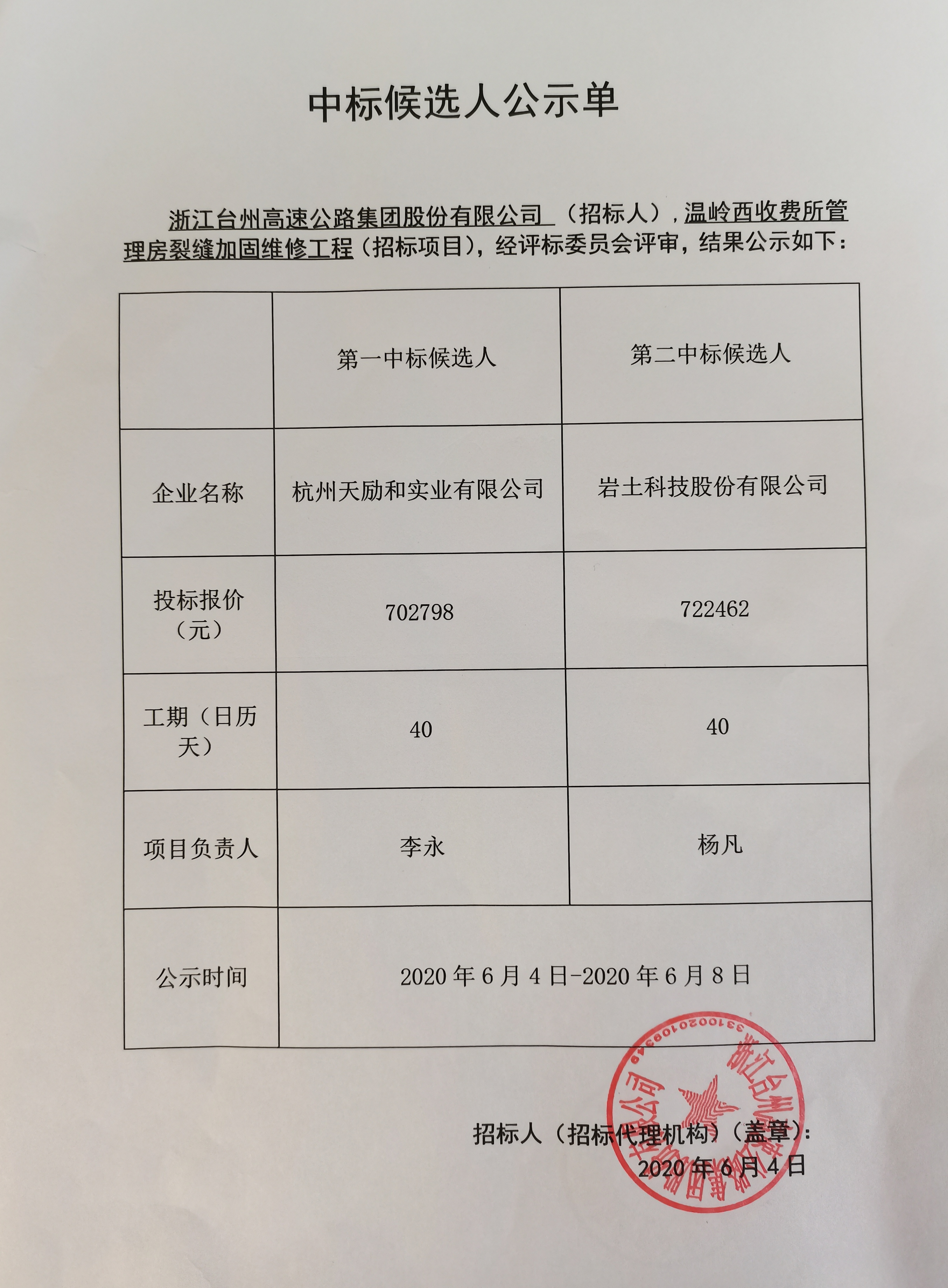 溫嶺西收費所管理房裂縫加固維修工程中標(biāo)候選人公示單