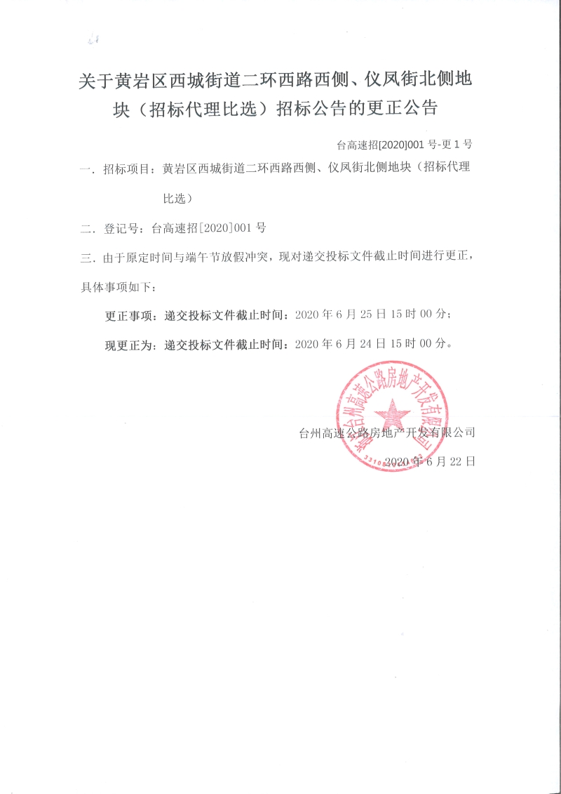 關于黃巖區西城街道二環西路西側、儀鳳街北側地塊(招標代理比選)招標公告的更正公告