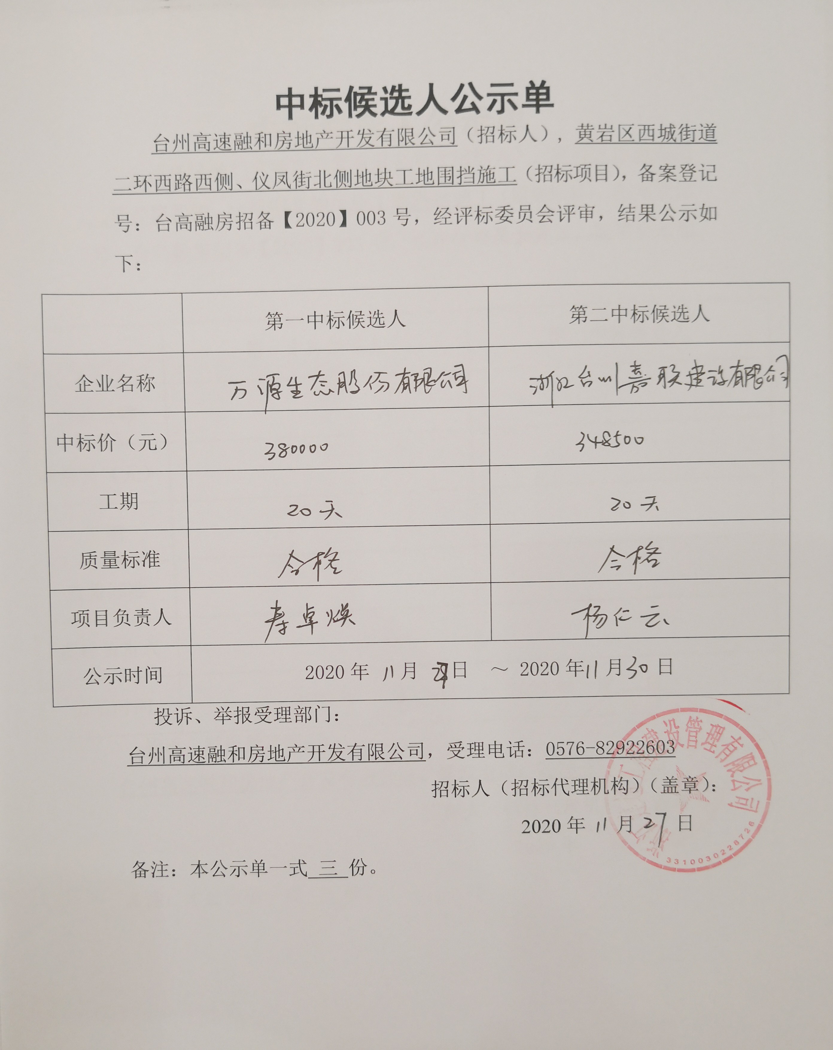 黃巖區(qū)西城街道二環(huán)西路西側(cè)、儀鳳街北側(cè)地塊工地圍擋施工(招標項目)中標候選人公示單