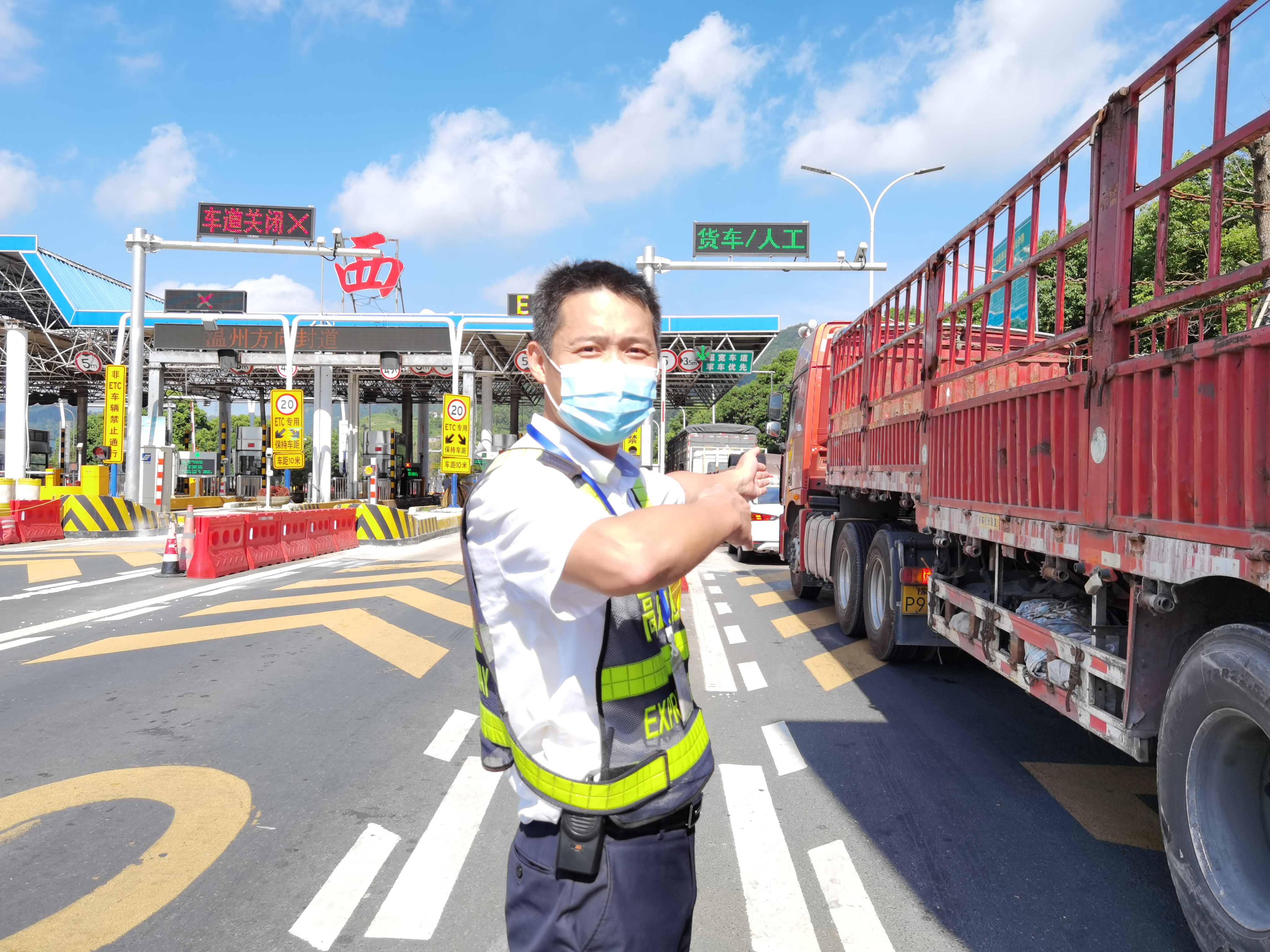 “師傅,慢點,注意后方來車,往左一點?!睖貛X西收費站入口處,一位身高一米七五左右的男同志正在維護著交通秩序。他就是征費三班班長李寧。酷暑高溫無法消磨他的斗志,揮汗如雨對他而言已是家常便飯。溫嶺西收費站車流量大,貨車多,當遇到三超車輛或者節假日的時候,入口處就會排成長龍。七八月份的太陽十分毒辣,經過一天的高溫,收費站入口的馬路上熱浪滾滾,人站在外面不到5分鐘就會汗流浹背。但為保持入口交通的安全暢通,李寧不斷做著各種不同的手勢,指揮著過往的車輛通行,絲毫顧不得擦拭順著臉頰流下來的汗水。他就是臺州高速上的最美堅守者。