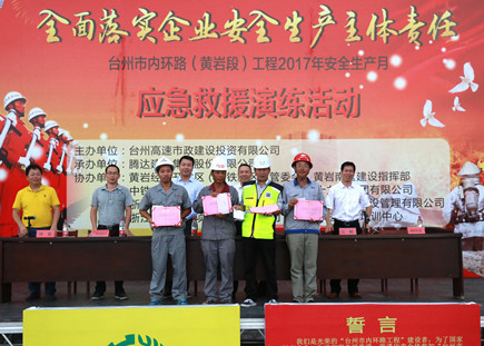 集團總工程師江輝,安全總監(jiān)項同富,騰達建設(shè)集團總經(jīng)理楊九如出席活動,黃巖東區(qū)、南區(qū)建設(shè)指揮部相關(guān)人員,內(nèi)環(huán)路(黃巖段)工程施工單位項目領(lǐng)導(dǎo)、專職安全員,市政公司全體員工參加活動。