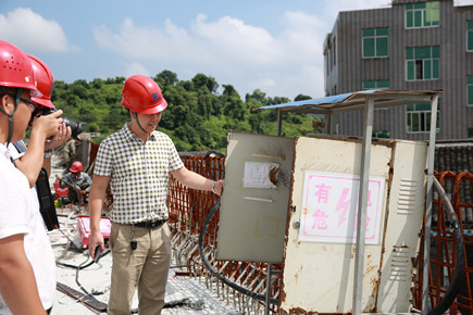圖為檢查組檢查6#立交施工現(xiàn)場(chǎng)用電安全情況