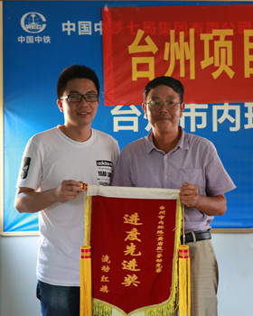 圖為為獲獎(jiǎng)施工單位頒發(fā)流動(dòng)紅旗